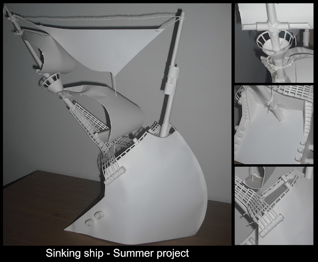 My uni summer project was to make an object of our choice using a peice of A1 paper, glue and a craft knife. I love 3d sculpture, it has always been something that I have enjoyed. I made a half sunken pirate ship out of paper I used paper for everything including the rope, where I twisted thin lengths of paper.